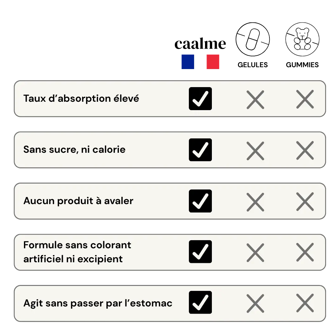 Contrairement aux comprimés qui agissent par pics (effet fort puis plus rien), la technologie transdermique des patchs Caalme diffuse ses actifs de manière stable et linéaire.